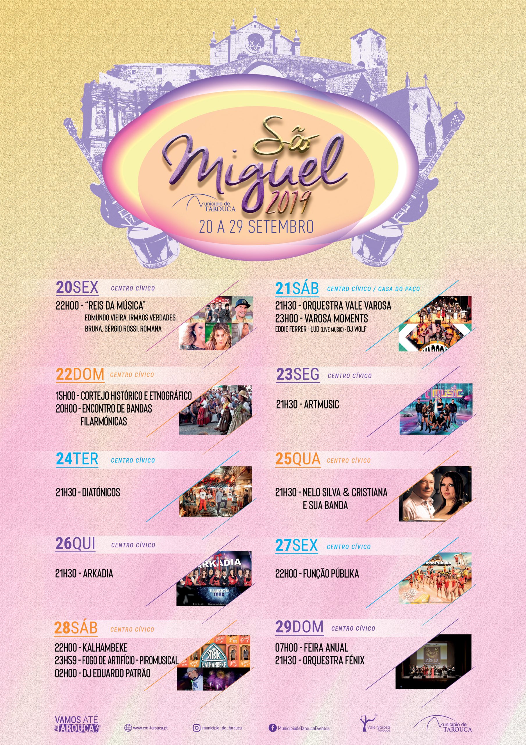 No dia 20 de setembro, pelas 21h00, serão oficialmente inauguradas as Festas de S. Miguel 2019 e, às 22h00, o Centro Cívico da cidade de Tarouca recebe o espetáculo dos Reis da Música Nacional, que contará com as atuações de Edmundo Vieira, Irmãos Verdades, Bruna, Sérgio Rossi e Romana.