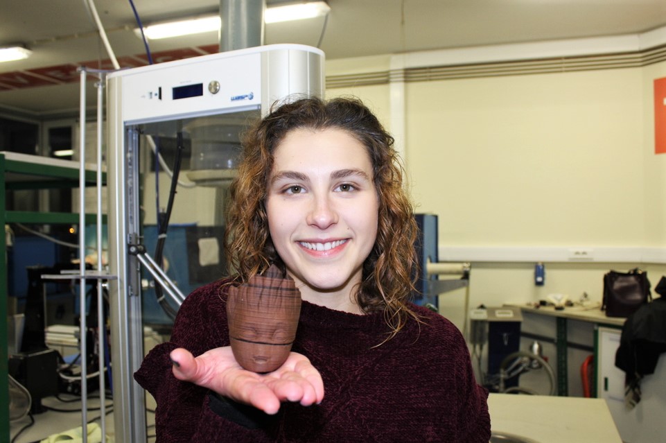 A estudante desvenda que se trata de “um filamento compósito que foi desenvolvido recorrendo a uma matriz plástica biodegradável e que incorpora partículas de cortiça que são parte de um resíduo resultante do processo de fabrico de rolhas”.