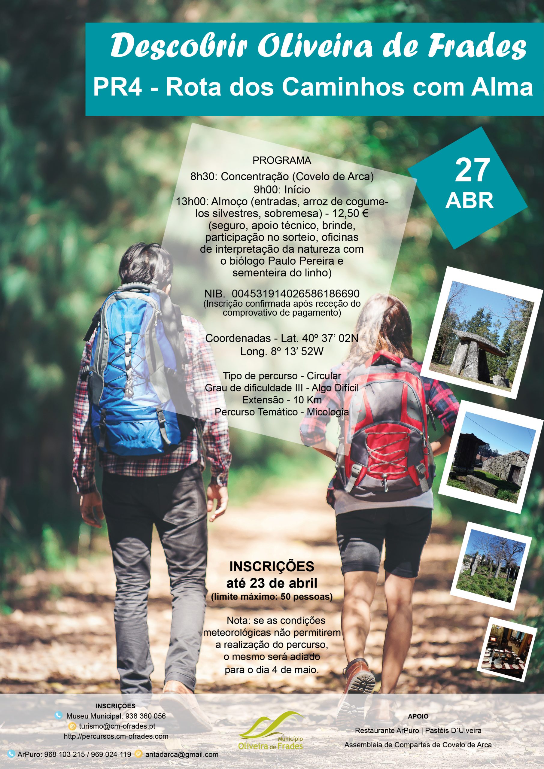 Na sequência do ciclo de percursos pedestres promovido pelo Município, irá decorrer o PR4 – Rota dos Caminhos com Alma no próximo dia 27 de abril (sábado), às 8h30, em Covelo de Arca. Durante o trilho com uma extensão de 10 km, os participantes para além do saudável contacto com a natureza, poderão visitar o Dólmen de Arca, classificado como monumento nacional desde 1910, entre outros locais de interesse turístico e histórico. Este percurso conta com o apoio da Assembleia de Compartes de Covelo de Arca, dos Pastéis D´ulveira e do Restaurante Ar Puro. Venha descobrir o concelho!